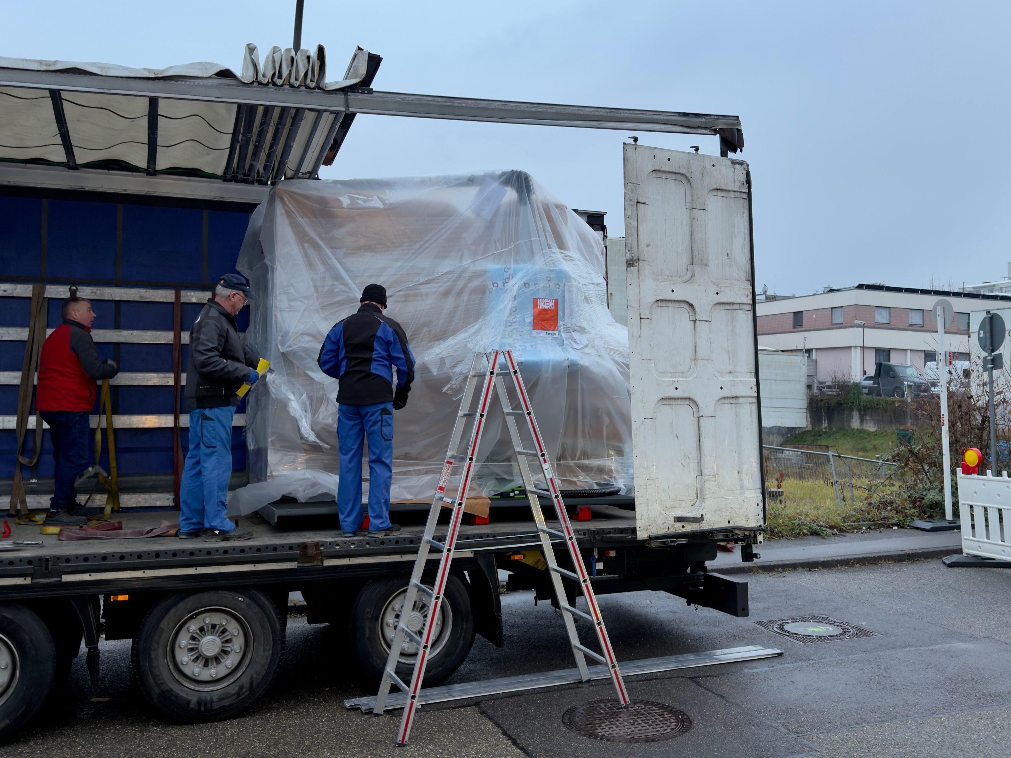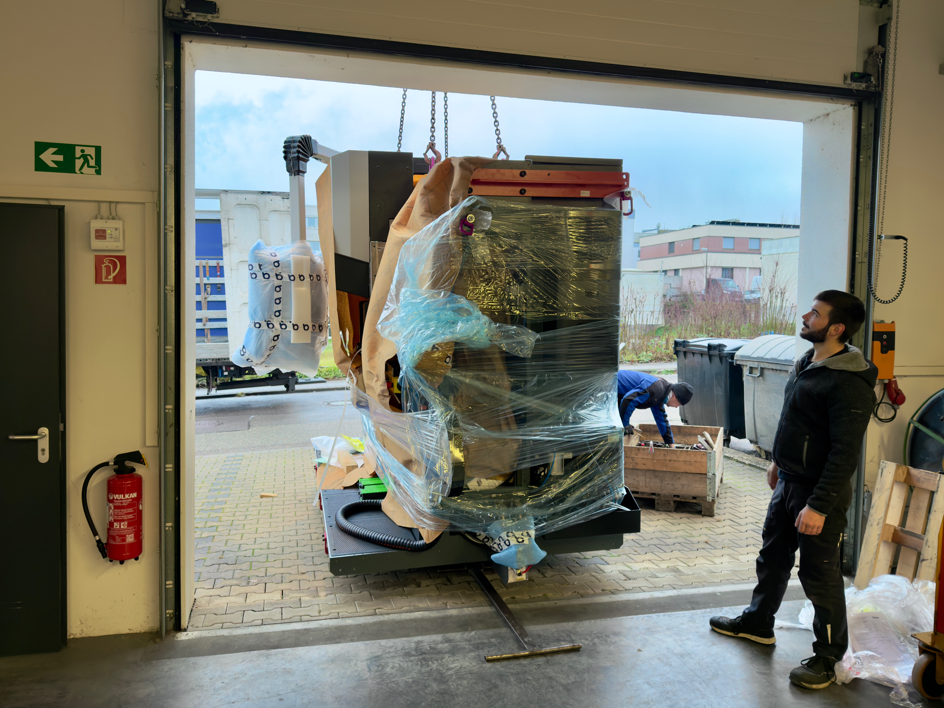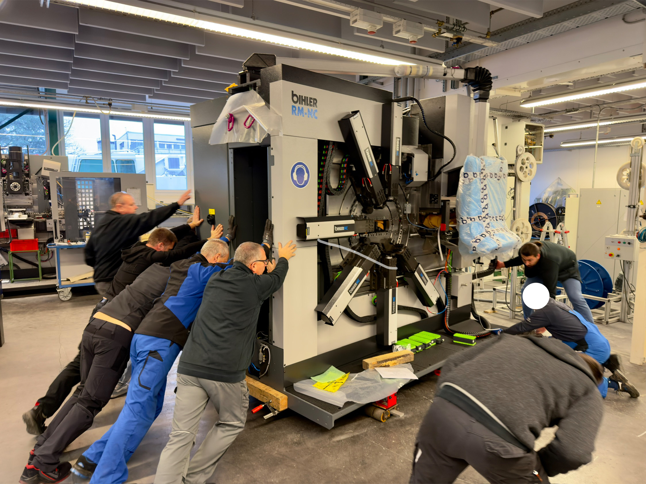 - Am frühen Morgen des 25. November 2025 um 8:00 Uhr wurde unsere neue BIHLER RM-NC Maschine geliefert. Mit Unterstützung eines Krans konnte die Maschine sorgfältig und präzise vom LKW abgeladen werden. Anschließend wurde sie – mit vollem Körpereinsatz und größter Sorgfalt – an ihrem zukünftigen Standort im Produktionsbereich positioniert.