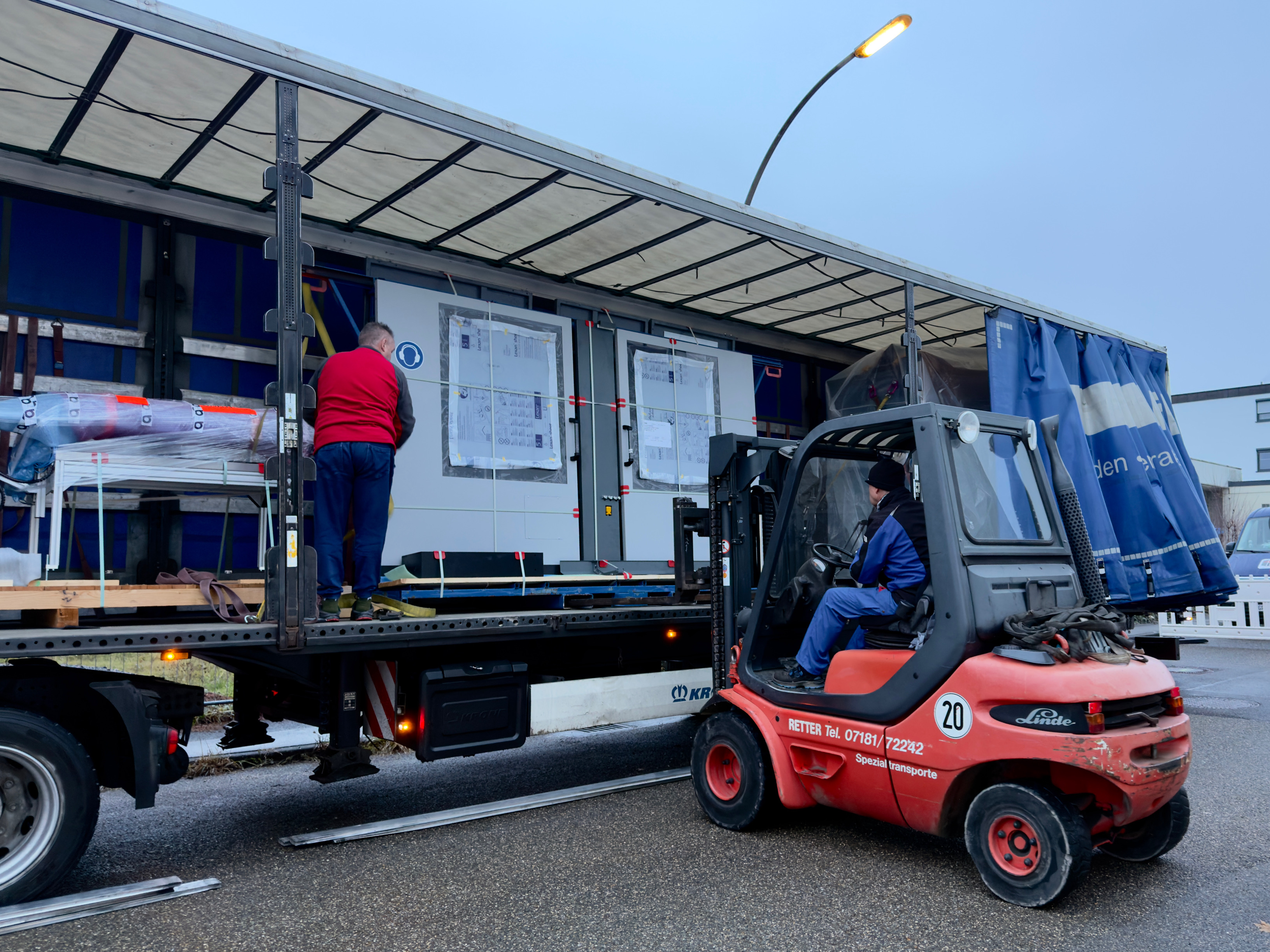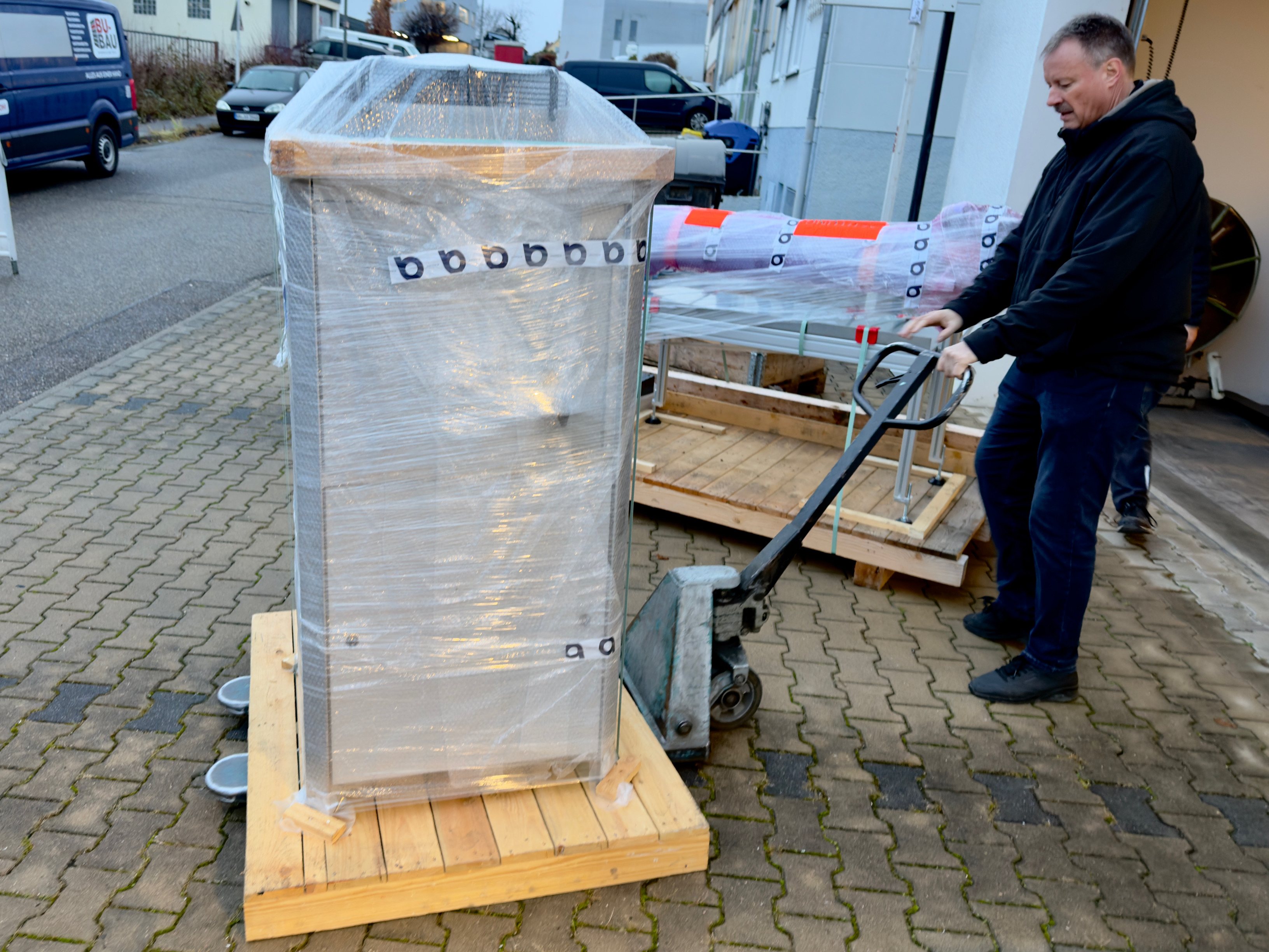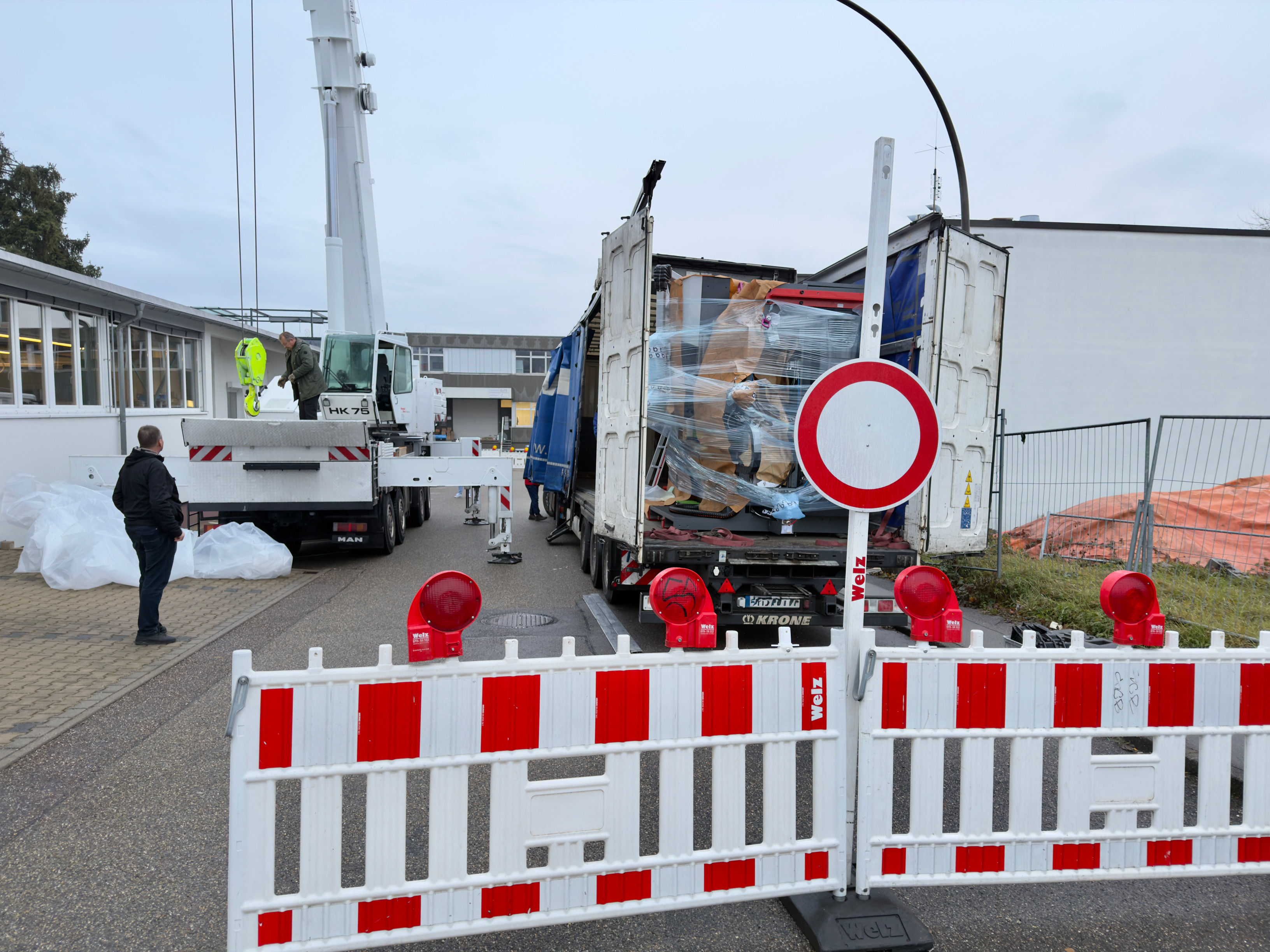 - Am frühen Morgen des 25. November 2025 um 8:00 Uhr wurde unsere neue BIHLER RM-NC Maschine geliefert. Mit Unterstützung eines Krans konnte die Maschine sorgfältig und präzise vom LKW abgeladen werden. Anschließend wurde sie – mit vollem Körpereinsatz und größter Sorgfalt – an ihrem zukünftigen Standort im Produktionsbereich positioniert.