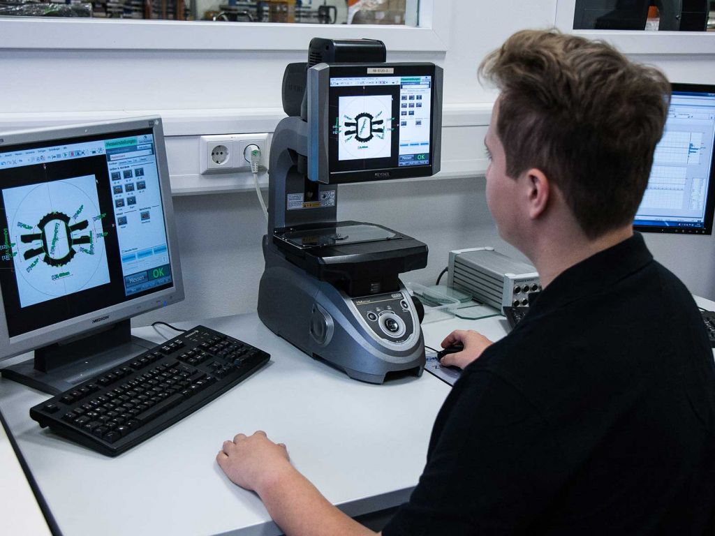 Für die Prozessüberwachung verfügen unsere Mitarbeiter neben konventionellen Messmitteln hauptsächlich über digitale optische Messtechnik(Keyence, Mahr, Mitutoyo,...) zum rationellen und wiederholgenauen Messen von Werkstücken. Es werden optische Profil-Projektoren und Maschinen zur optischen CNC-Messung, Konturvermessung und Federkraftmessung(Zeiss) eingesetzt mit der Möglichkeit zu umfangreichen 2D- und 3D-Auswertungen.